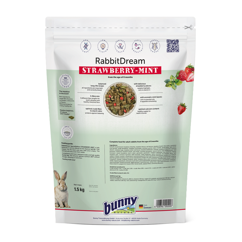 L’aliment complet Granulés Lapin Édition Spéciale Fraise & Menthe allie 63 plantes et herbes issues de prairies non traitées à de savoureux morceaux de fraises et des feuilles de menthe aromatiques. Cette recette fruitée et rafraîchissante soutient la digestion, la santé du pelage et l’équilibre de la flore intestinale.