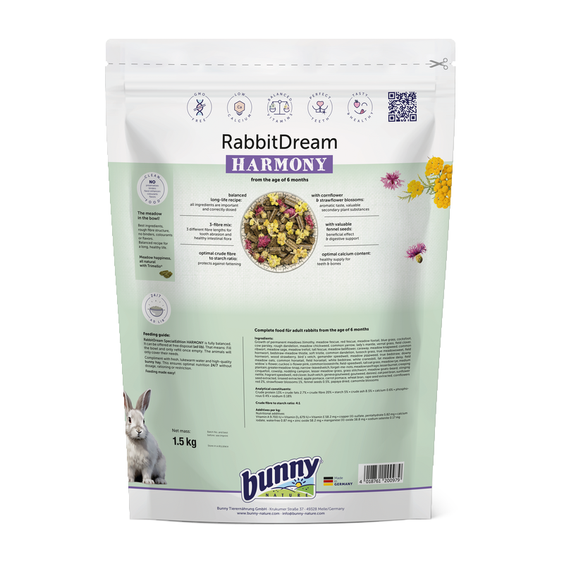 L’aliment complet Granulés Lapin Édition Spéciale Harmony associe 63 plantes et herbes issues de prairies non traitées à des fleurs de bleuet, d’immortelle et des graines de fenouil. Ce mélange aromatique favorise la digestion, la santé du pelage et la flore intestinale, tout en soutenant naturellement les dents et les os.