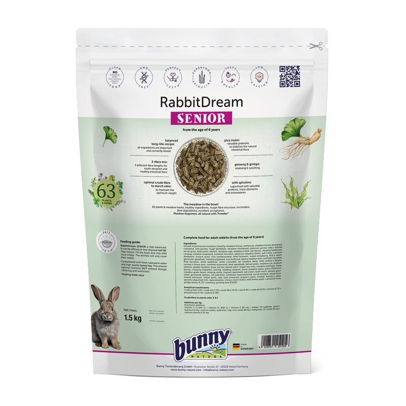 L’aliment complet Granulés Lapin Senior est spécialement formulé pour répondre aux besoins des lapins âgés. Enrichi en ginseng, ginkgo et spiruline, il soutient la vitalité, la digestion et la flore intestinale. Son mélange de 63 plantes et herbes favorise la santé du pelage, des dents et des os tout en contribuant au bien-être général.
