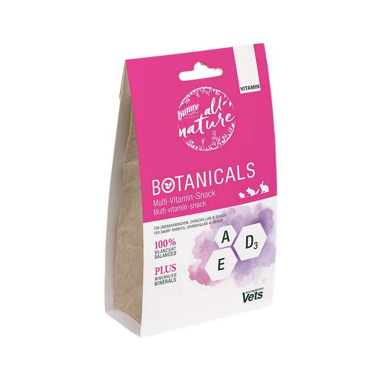 Botanicals VITAMIN – Collation multivitaminée assure un apport équilibré en vitamines et oligo-éléments essentiels pour les lapins, chinchillas et octodons. Ce complément naturel soutient le métabolisme et compense les variations nutritionnelles des plantes tout au long de l’année.